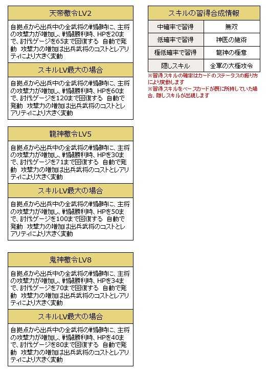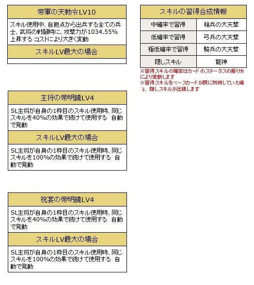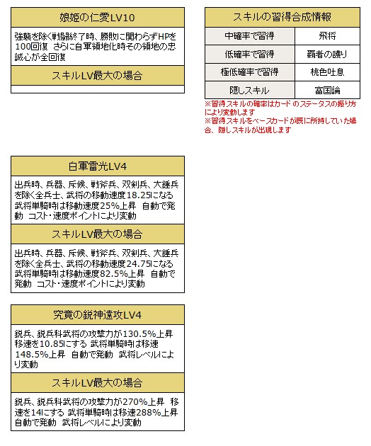 ・紹介している武将のスキルの効果値などは、該当の武将が所持している場合の効果値です。