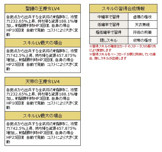 ・変化系スキルを所持している武将カードの1枠目のスキルが発動した際、同じ効果で発動します。
