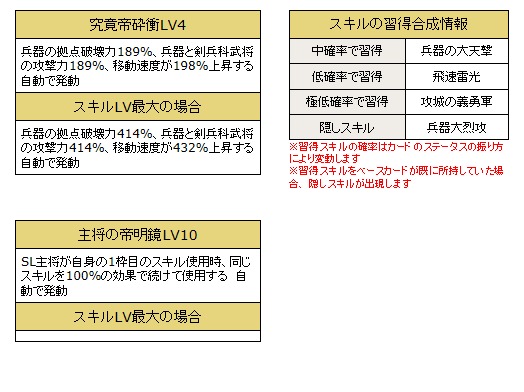兵器の拠点へのダメージを上昇させる攻城系スキルや、