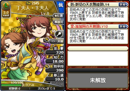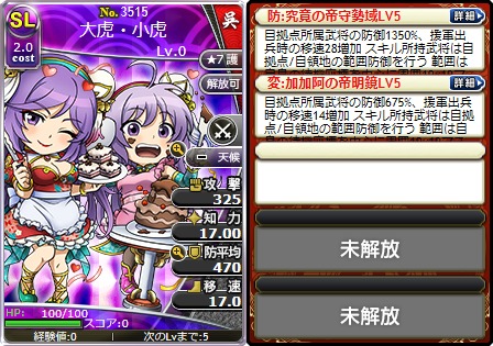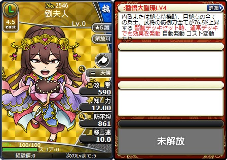 武将カードはLv0、ステータスポイントは割り振りしていない状態で表示されています。