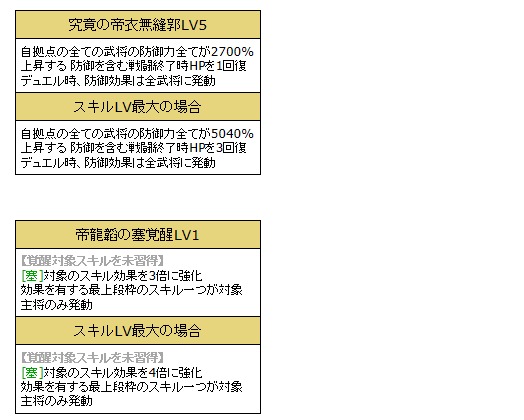 「究竟の帝衣無縫郭(くっきょうのていいむほうかく)LV5」「帝龍韜の塞覚醒LV1」を所持した