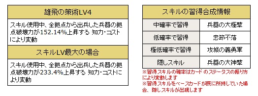 同一スキルであっても武将のコスト、スキルLV、ステータス等により効果値が異なる場合があります。