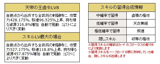 同一スキルであっても武将のコスト、スキルLV、ステータス等により効果値が異なる場合があります。
