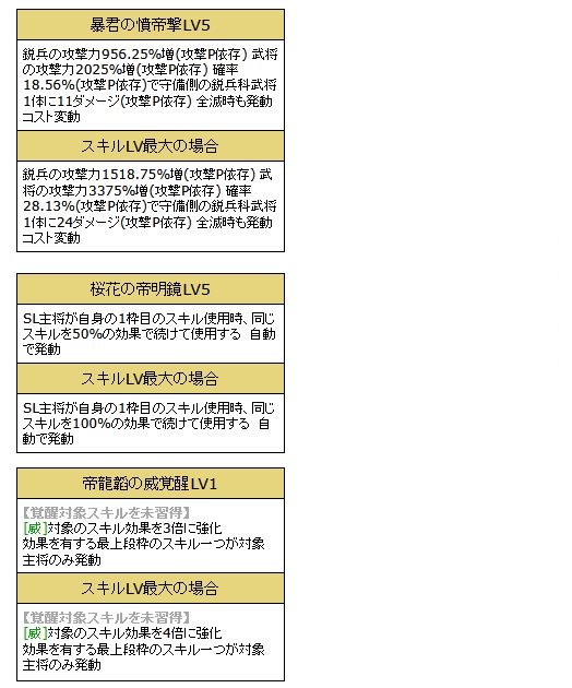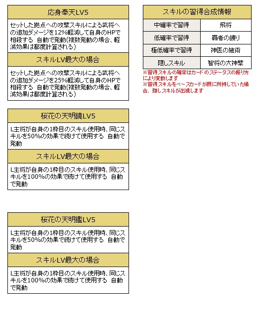 ・紹介している武将のスキルの効果値等は、該当の武将が所持している場合の効果値です。