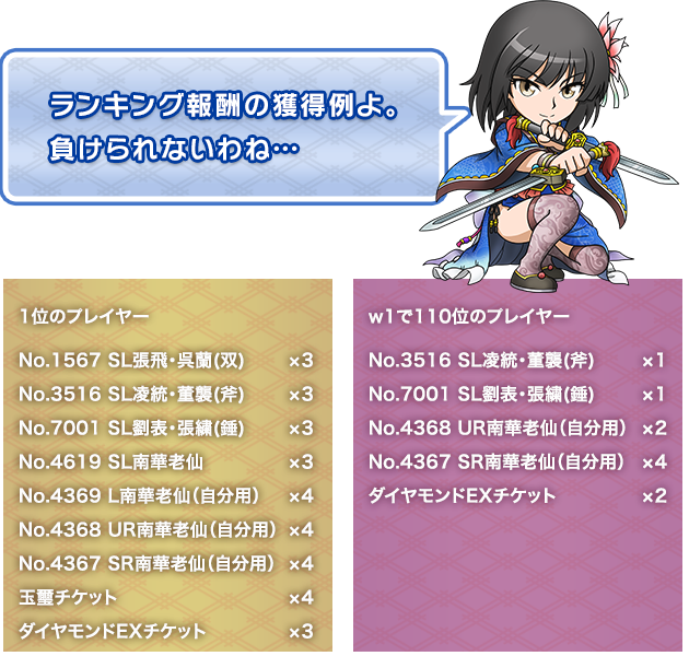 | 1~50位 | 1~25位 | No.7001 SL劉表・張繍(錘) ×1 No.4368 UR南華老仙(自分用) ×1 ダイヤモンドEXチケット ×1 |