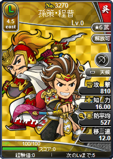 弱冠十七才で独立、江東を瞬く間に平定して小覇王と呼ばれた孫策。もともと孫堅の腹心で、最古参の将であった程普。孫堅の死後は孫策に従い、各地で数々の功績を挙げた。孫策が宋部一揆の大軍に囲まれた時には、程普ともう一人の騎兵とで敵の包囲網に突撃し、孫策を脱出させることにも成功している。
