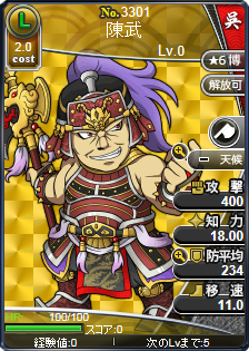 孫策の元で各地で戦功を挙げてみるみる出世し、陳武の指揮する軍団は精鋭揃いで負け知らずだったという。その後孫権の元に就いた際も合肥戦にて七尺七寸の長身を活かし数々の武将をなぎ倒す活躍を見せるが、あえなく討ち取られる事となる。陳武はその見た目とは裏腹に非常に思いやりのある人物で民からも愛され、孫権からも特別な寵愛を受けていた。陳武の死を知った孫権は大いに悲しみ、葬儀にも直接参加したという。