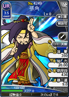 大賢良師を自称した、黄巾の乱の首謀者。官吏登用試験の落第生であった頃、とある山中にて南華仙人と出会い、「太平要術」全三巻を与えられ、修行の末に道術を会得した。その妖術と数十万の信徒の力で官軍を苦しめるが、争乱の最中に病を得て没した。