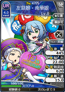 「ブラウザ三国志」13周年記念カード。13周年のお祝いに可愛い風船を用意したよ。左慈娘も風船お一つどうぞ。風船って持ってるだけでウキウキな気分になって楽しいよね!ふぁ~・・・可愛い風船をありがとう。ふふっ・・・体が浮くぐらい大量の風船を持ってみるのも、それはそれで愉しそうね。