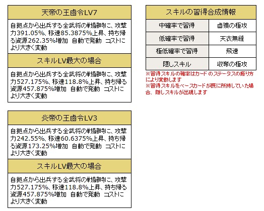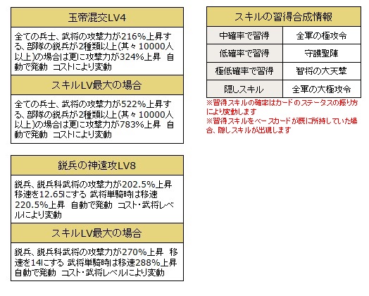 ・紹介している武将のスキルの効果値等は、該当の武将が所持している場合の効果値です。