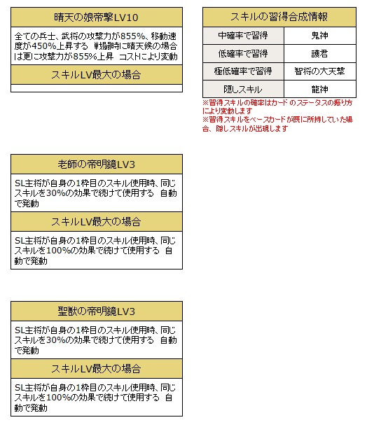 ・変化系スキルを所持している武将カードの1枠目のスキルが発動した際、同じ効果で発動します。