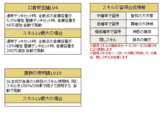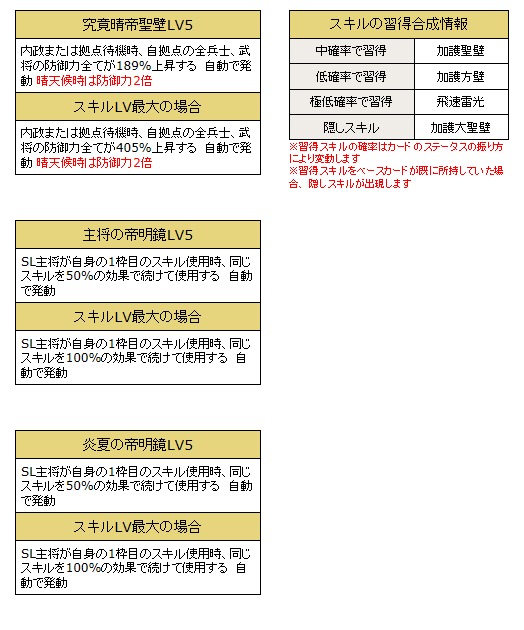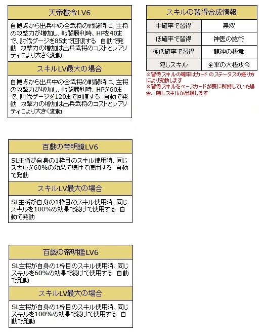 ・変化系スキルを所持している武将カードの1枠目のスキルが発動した際、同じ効果で発動します。