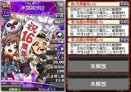 武将カードはLv0、ステータスポイントは割り振りしていない状態で表示されています。