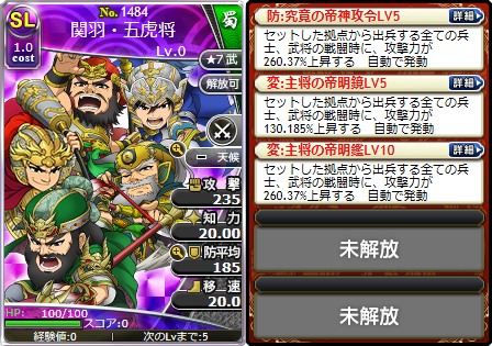「主将の帝明鑑LV10」を所持した「No.1484 SL関羽・五虎将」、