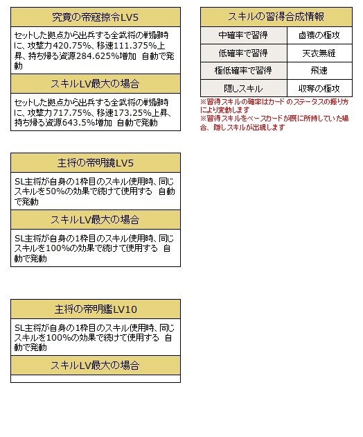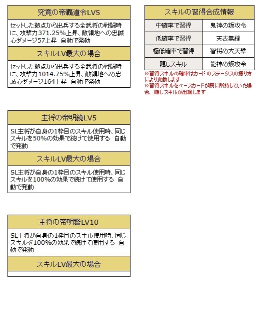 ・紹介している武将のスキルの効果値等は、該当の武将が所持している場合の効果値です。