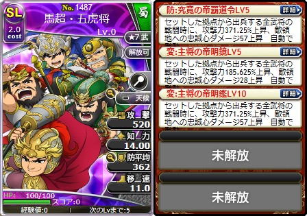 「主将の帝明鑑LV10」を所持した「No.1487 SL馬超・五虎将」、