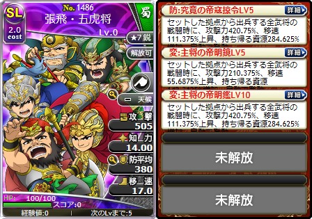 「主将の帝明鑑LV10」を所持した「No.1486 SL張飛・五虎将」、