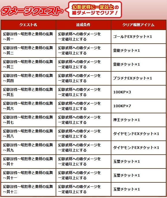 幻影武将へ与えた総ダメージ数に応じてクリアできるクエストや