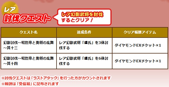 さらに、レア幻影武将クエストの報酬でも「ダイヤモンドEXチケット」が獲得できます!