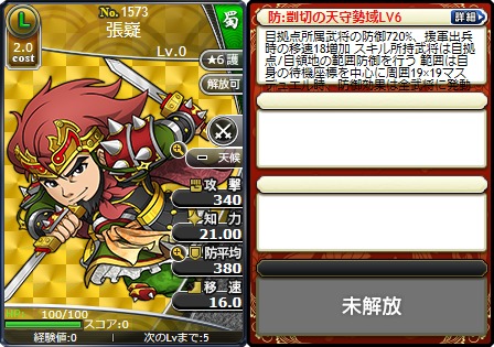 武将カードはLv0、ステータスポイントは割り振りしていない状態で表示されています。